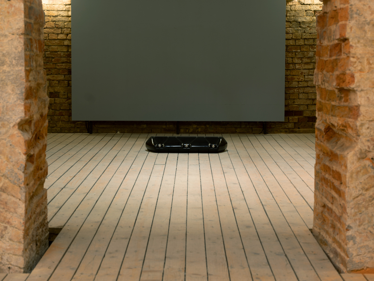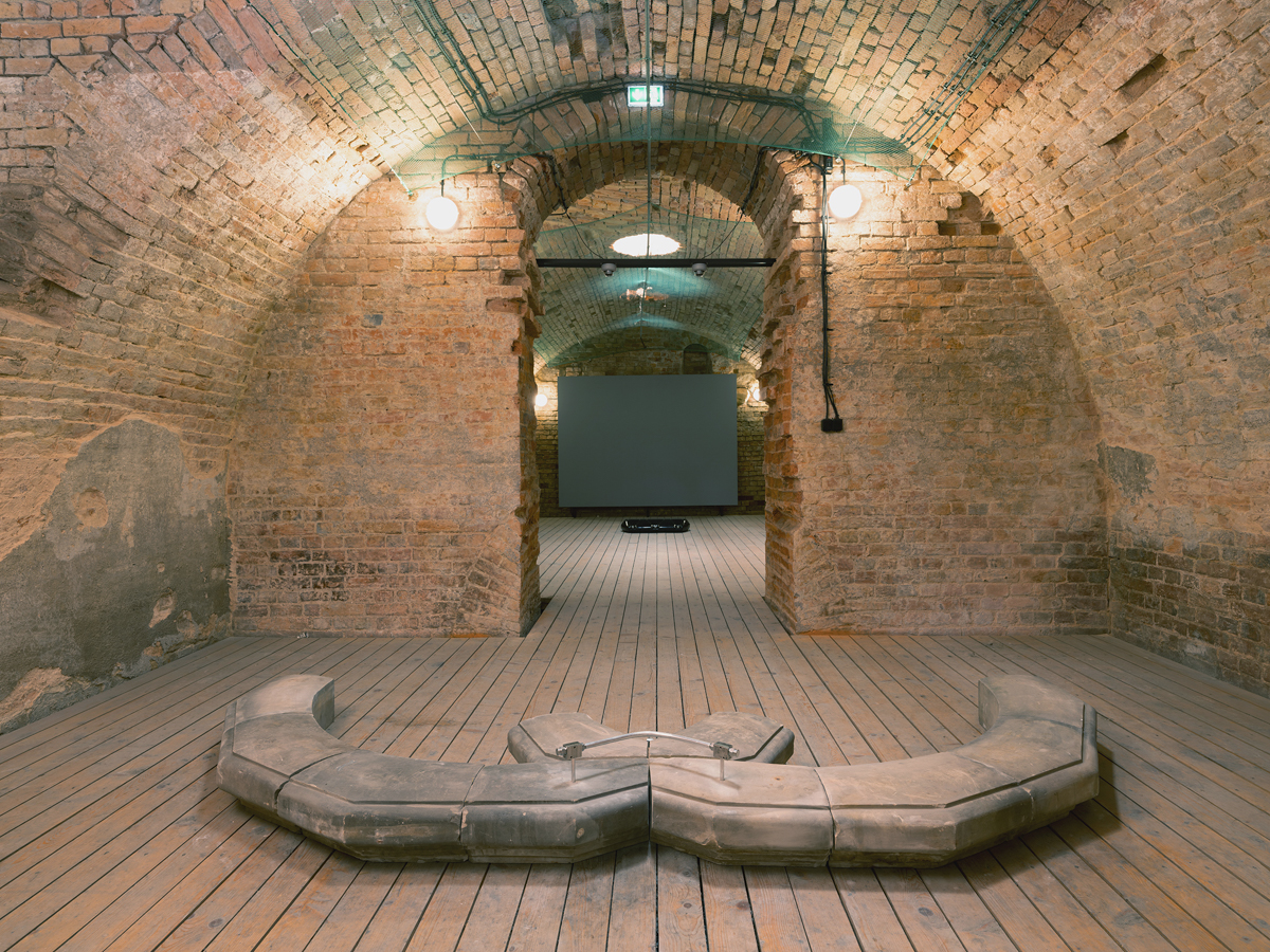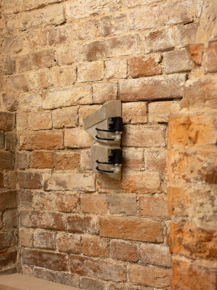 "Using the logic of submersion, viewers descend into the cistern where they are exposed to near-infrared light, a spectrum of light that is invisible to the human eye, but encourages cell regeneration. Photographs in grayscale have been taken with an infrared camera to capture that spectrum of light. Central to this body of work was the investigation of factors exterior to the body that encourage the production of human growth hormone (HGH). The compounds suspended in latex in the sculpture Growth Factors stimulate its production. Twin Exedra was created using stone remnants from the castle's renovation when it was rebuilt in the 1980s after suffering damage in WW2, incorporating the building’s own healing process. An exedra is a form from classical architecture, a semi-circular alcove used for rest, gathering, and reflection."