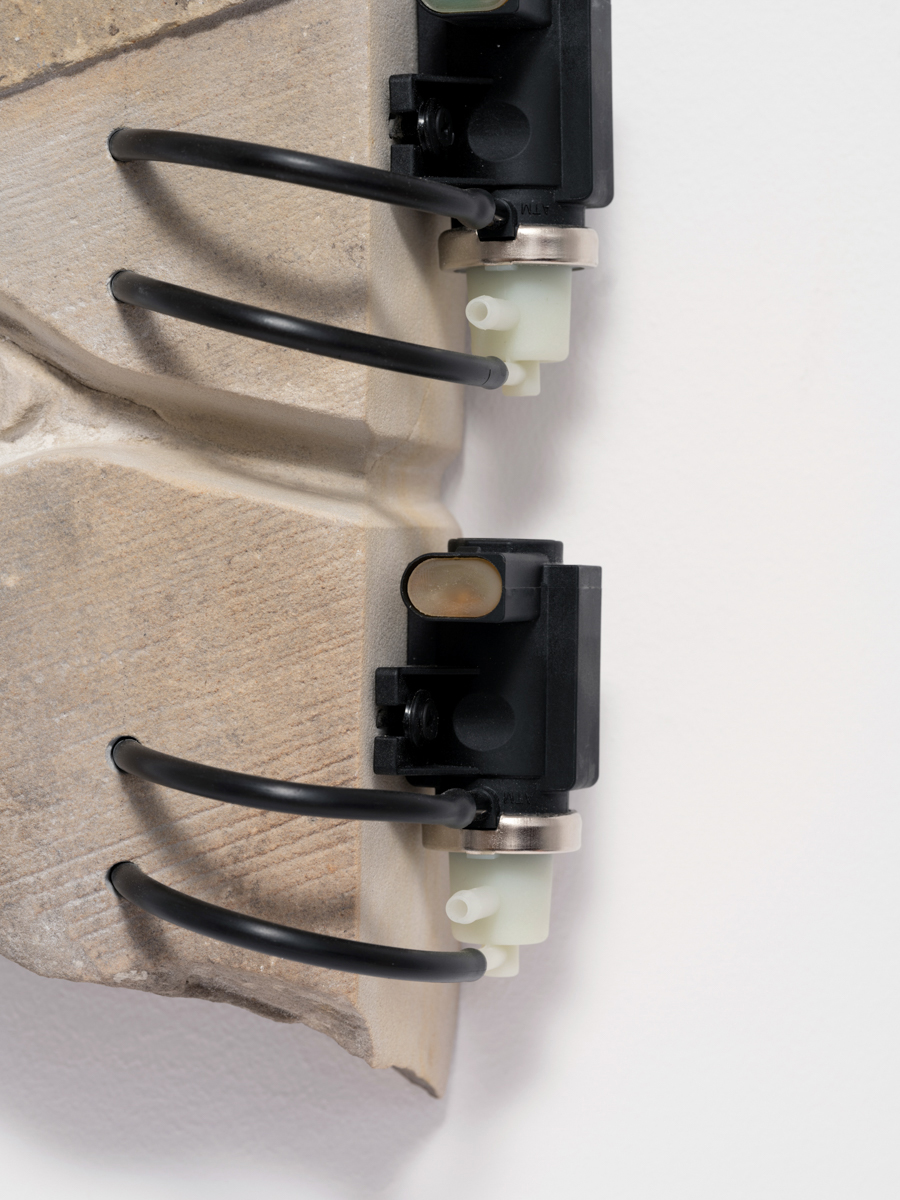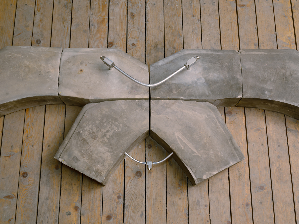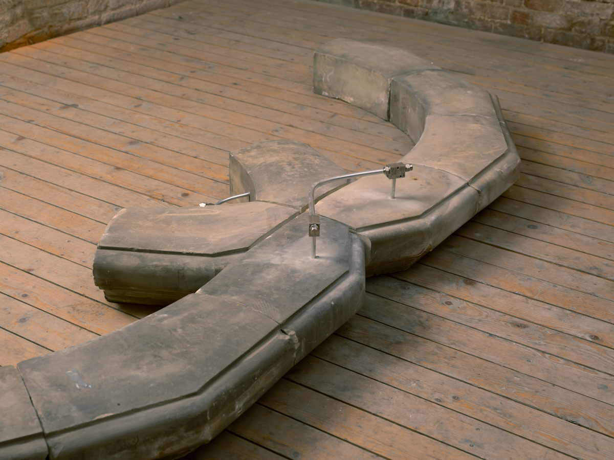 Twin Exedra, 2025, sandstone, aluminum, pneumatic hardware 11.5 x 3.9 x 0.7ft, 3.5, 1.2, 0.2 meters.