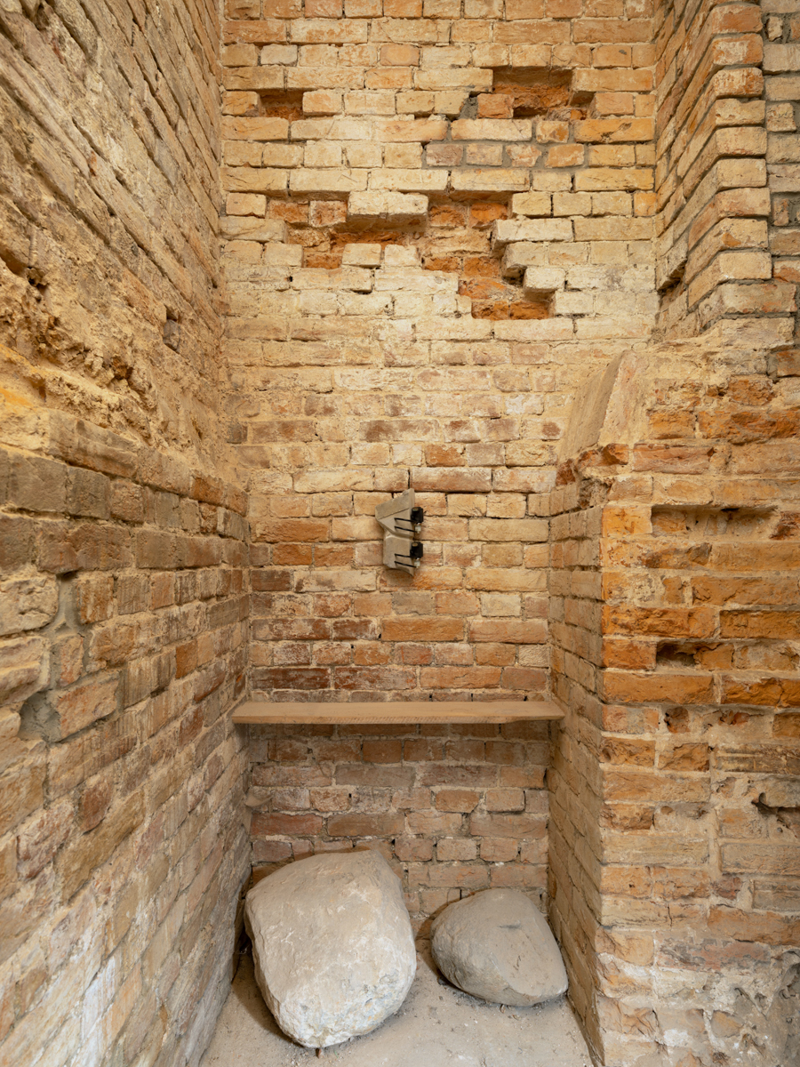 "Using the logic of submersion, viewers descend into the cistern where they are exposed to near-infrared light, a spectrum of light that is invisible to the human eye, but encourages cell regeneration. Photographs in grayscale have been taken with an infrared camera to capture that spectrum of light. Central to this body of work was the investigation of factors exterior to the body that encourage the production of human growth hormone (HGH). The compounds suspended in latex in the sculpture Growth Factors stimulate its production. Twin Exedra was created using stone remnants from the castle's renovation when it was rebuilt in the 1980s after suffering damage in WW2, incorporating the building’s own healing process. An exedra is a form from classical architecture, a semi-circular alcove used for rest, gathering, and reflection."