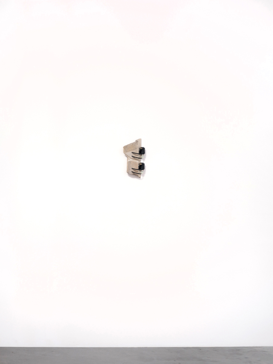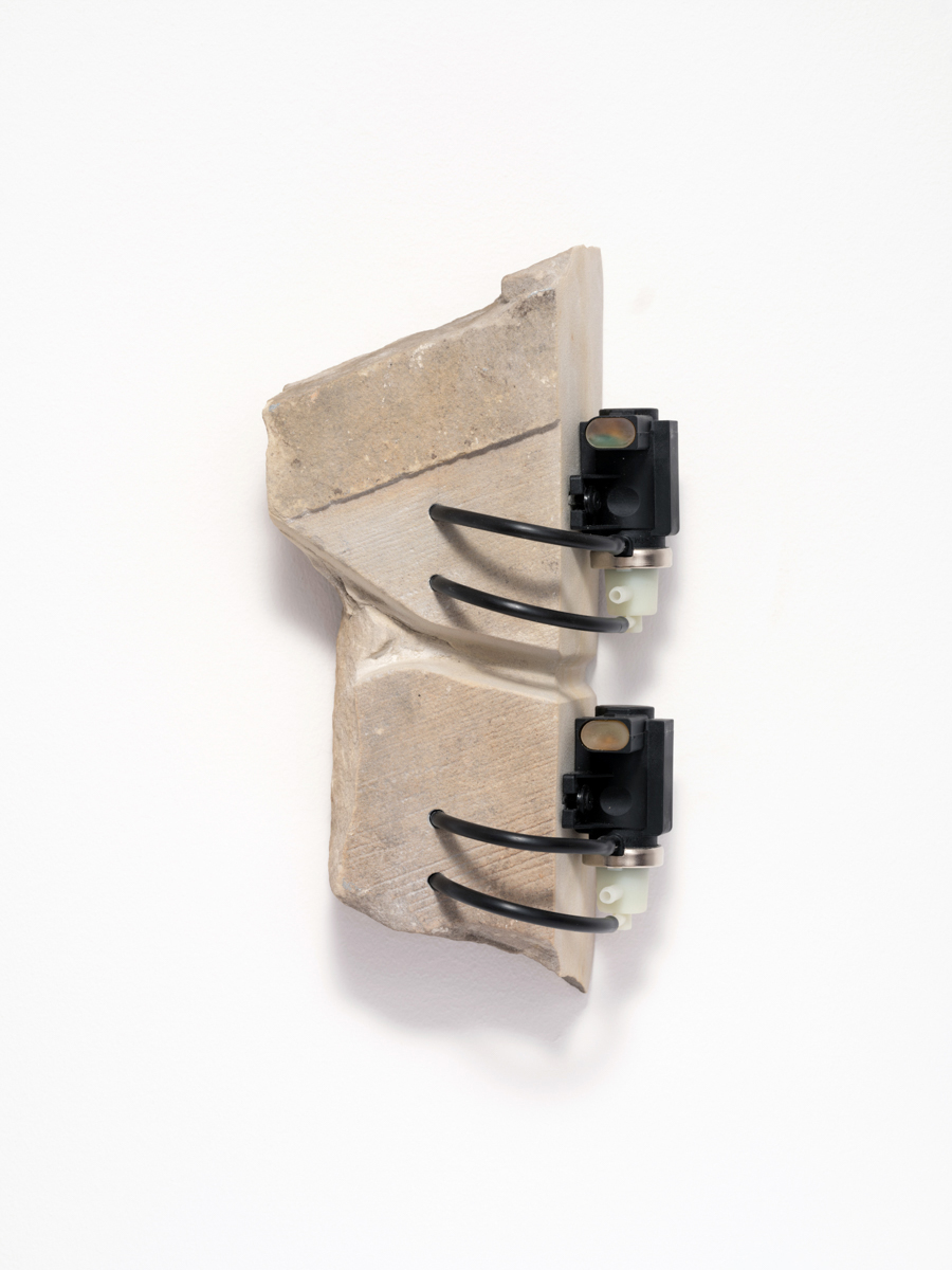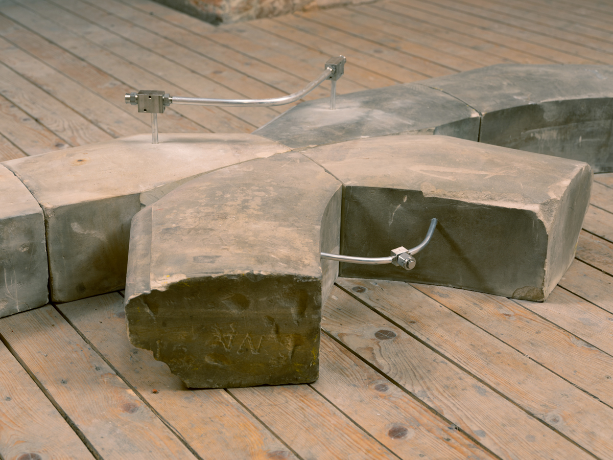 Twin Exedra, 2025, sandstone, aluminum, pneumatic hardware 11.5 x 3.9 x 0.7ft, 3.5, 1.2, 0.2 meters.