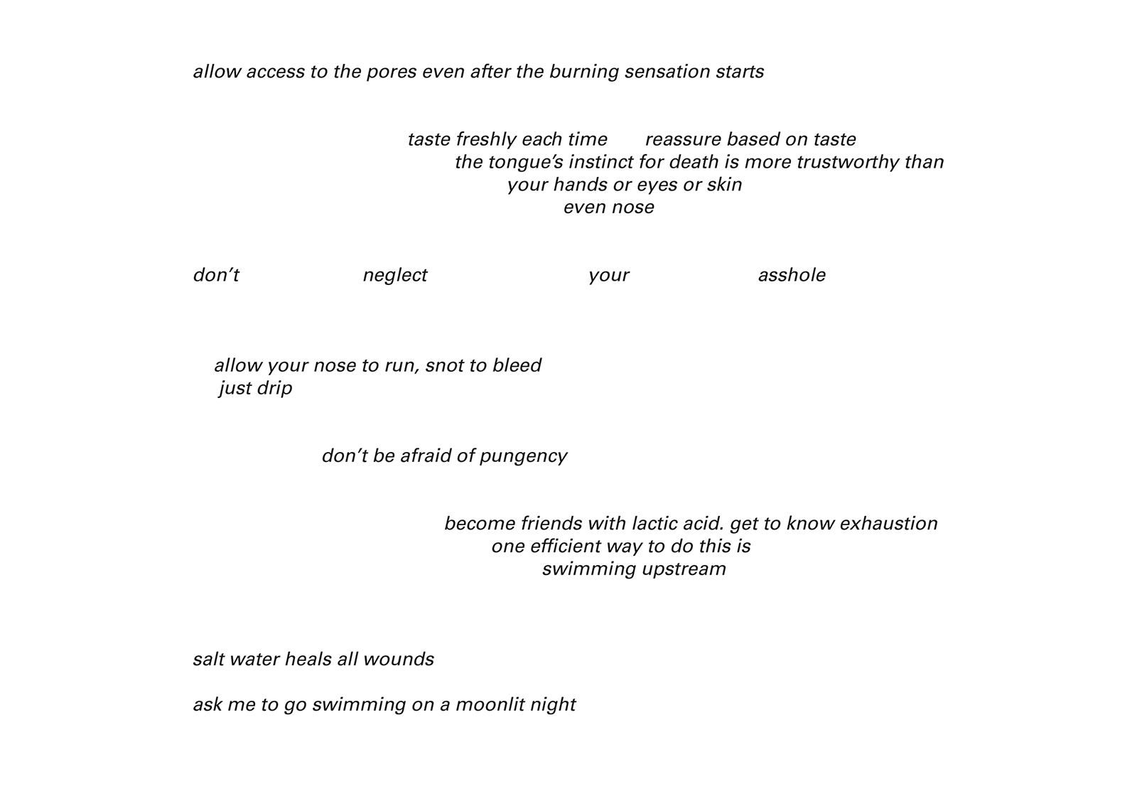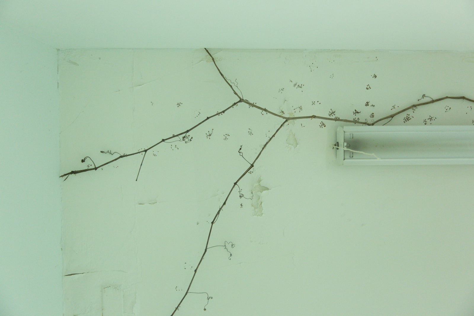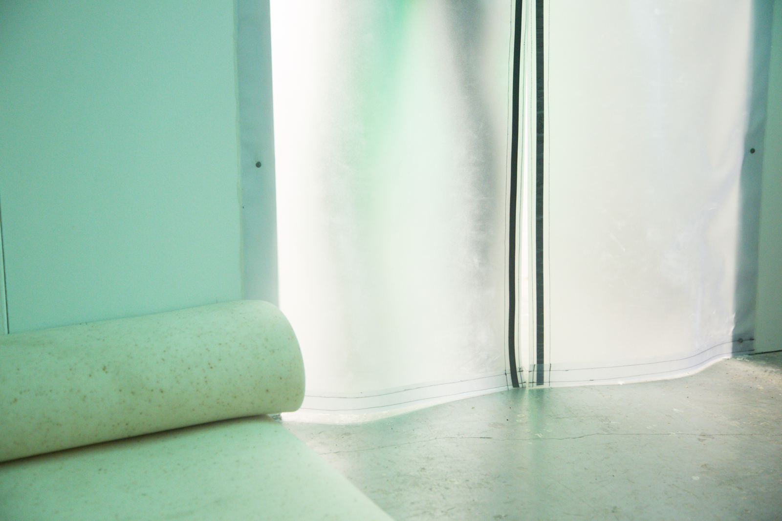 "A series of interventions over 4 floors in the back sections of the gallery, previously used as storage and service entrances. Inspired by a nearby forest pond and amphibiousness as a queer affect of transforming."