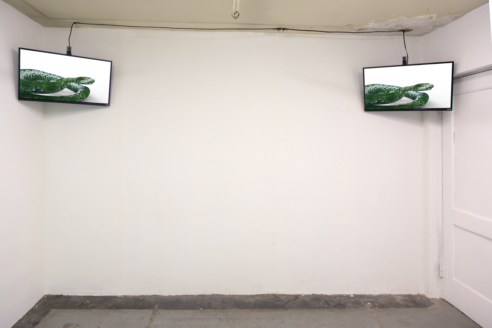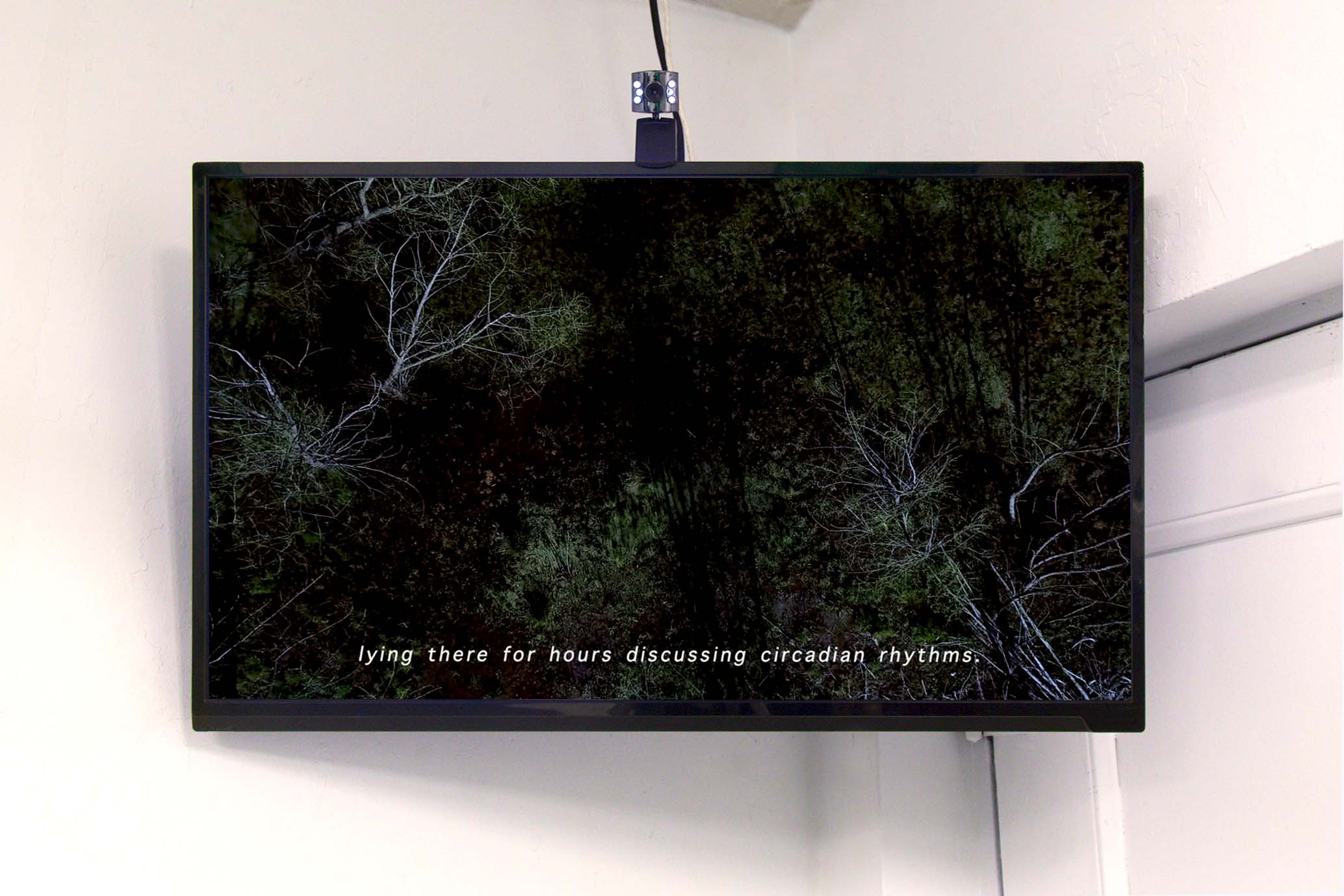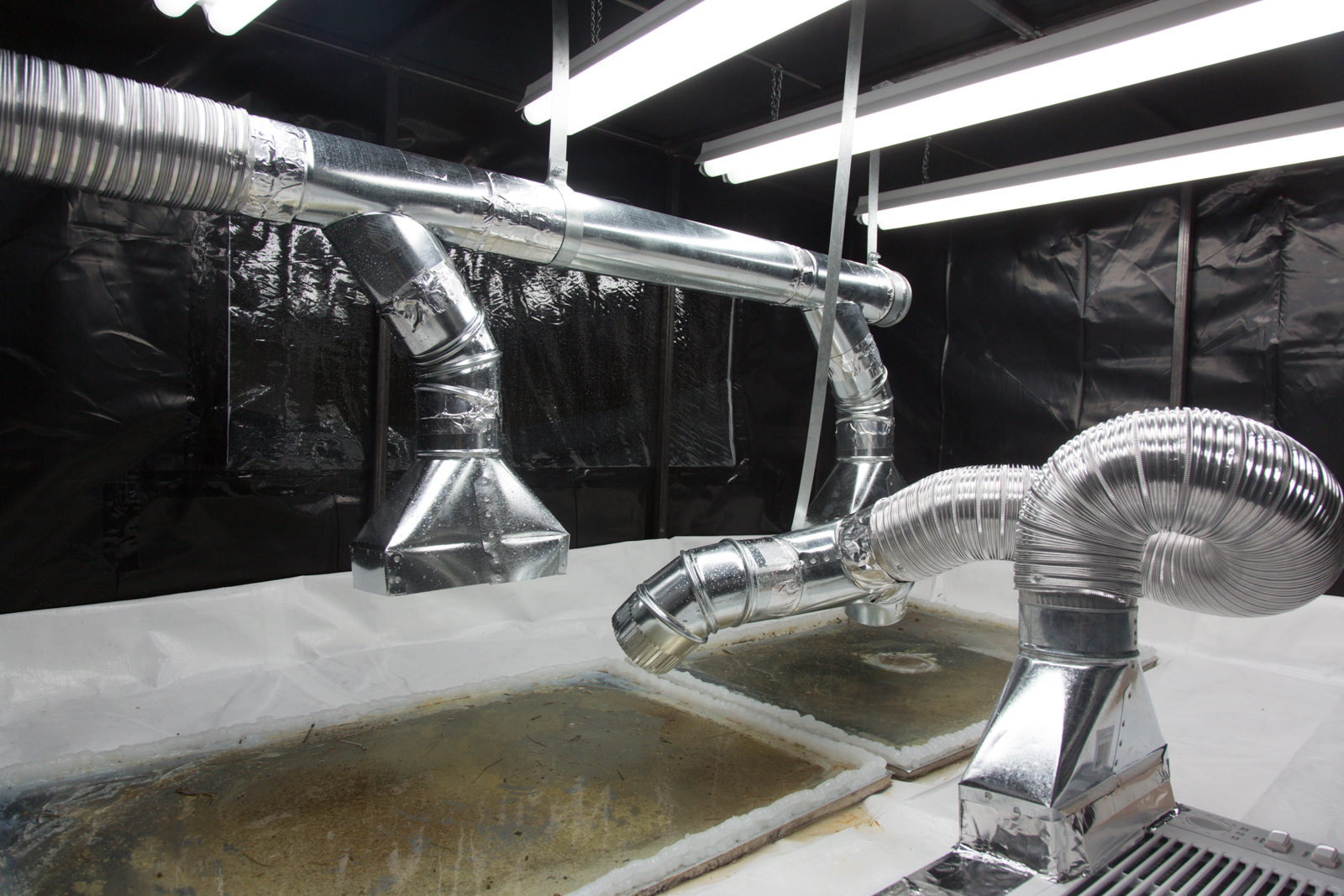 The Pond, 2018, Installation: wood, drywall, acrylic, metal, textiles, vinyl, humidifier, air conditioner, ventilation duct and fans, tile board, plumbing, silicone caulking, plastic, epoxy resin, charcoal, pond water, vines, dried wasps nests, tadpoles, stinging nettle, variable dimensions, 4-channel HD video, 8'53", color, sound.